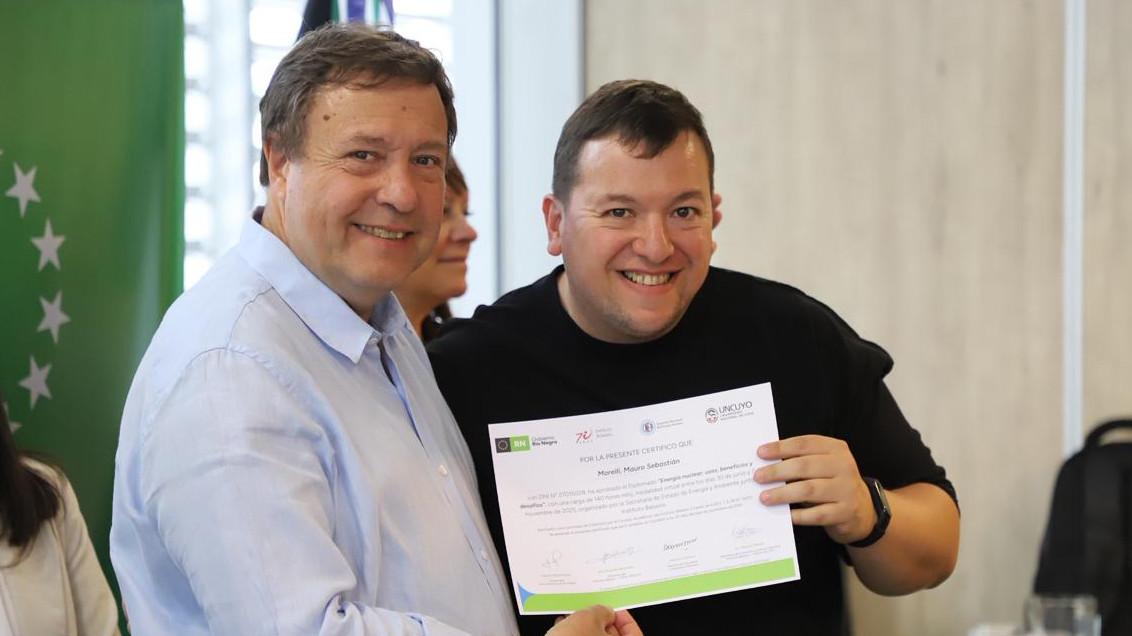 El Gobernador Alberto Weretilneck encabezó en Cipolletti la entrega de certificados de un diplomado y dos cursos sobre “Energía nuclear, radiaciones, radiactividad y ambiente” dictados por el Instituto Balseiro, en conjunto con el Gobierno de Río Negro. Las clases y actividades se desarrollaron mediante una modalidad virtual y estuvieron dirigidas a residentes de la provincia.